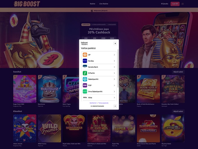 Suomalaisille pelaajille suunnattu Big Boost nettikasino avautui vuonna 2023 laajentaen tunnettujen sisarkasinojensa perhettä. Sivustolla voit pelata ilman rekisteröitymistä vaivattomasti, sillä talleta ja pelaa -painikkeen avulla pääset suoraan käsiksi laajaan kasinopelivalikoimaan. Lisäksi Big Boost hyödyntää Brite-pikapankkipalvelua, joka mahdollistaa nopeat ja sujuvat kotiutukset.