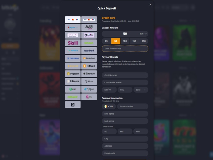 Nopean rekisteröitymisen jälkeen pelaajat voivat hyödyntää monia käteviä maksutapoja, mukaan lukien kryptovaluutat, nettilompakot, prepaid-maksutavat, korttimaksut ja pankkisiirrot. Hyväksytyt kryptovaluutat ovat Bitcoin, Ethereum, Litecoin, Ripple, Tether, Dogecoin, Bitcoin Cash, BinanceCoin, Cardano ja Tron. Kasino tarjoaa myös mahdollisuuden ostaa kryptovaluuttaa Mercurio ja MoonPay maksupalvelujen avulla. Vähimmäistalletussumma on 20 euroa tai vastaava summa muussa valuutassa.