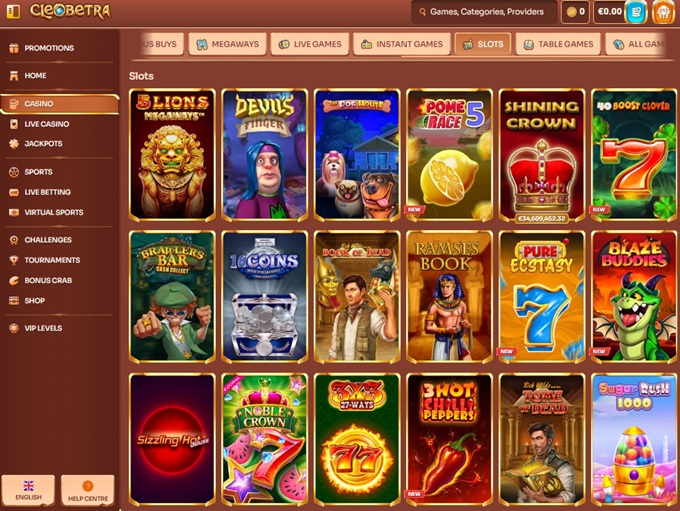 Cleobetra Casinon pelivalikoima on laaja, ja tarjolla on yli 5 700 kasinopeliä. Pelikirjasto on jaettu selkeästi kasinopelien, livekasinon ja jättipottipelien kategorioihin. Lisäksi sivustolta löytyvät urheiluvedonlyönti, live-urheilu sekä virtuaaliurheilu.